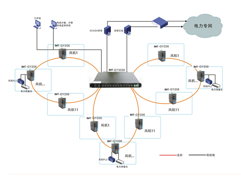 根據風場實際情況,33臺風機建議組成3個環,每11臺組一個環網,每臺風機中的OP-GY206的2個上聯百兆光口與其他風機中的OP-GY206的百兆光口組成環網,靠近監控中心的風機中的OP-GY206的其中一個百兆光口與中心機房的OP-GY3028百兆光口連接,另外一個光口和附近的風機的OP-GY206光口組成環網。6個電口與風機中的PLC、測量儀等設備連接。